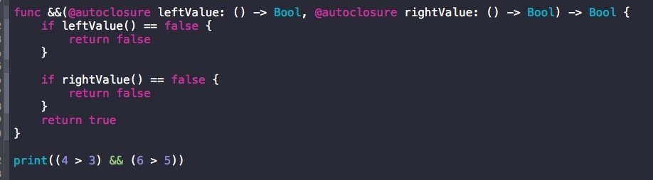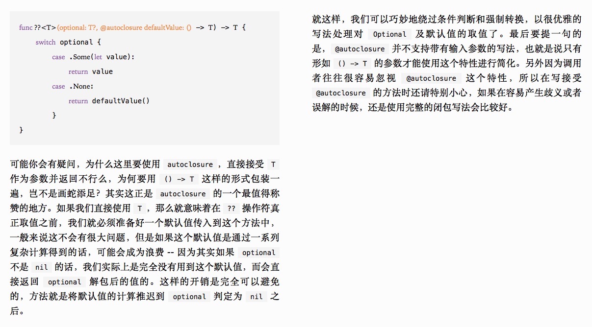 在 Swift 中,其实 && 和 || 这两个操作符里也用到了 @autoclosure。作为练习,不妨打开 Playground,试试看怎么实现这两个操作符
